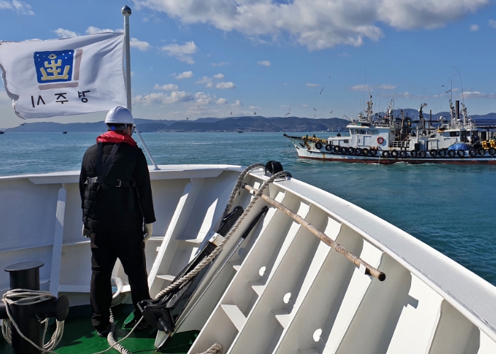 ▲ 경주시 해양복합행정선 ‘문무대왕호’가 해수면 불법어업 특별단속에 나선 가운데, 단속 요원이 인근 어선을 주시하고 있다. 경주시는 5월 한 달간 주요 항·포구를 중심으로 관계기관과 합동 단속을 실시할 예정이다. |