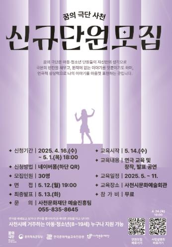 [무한뉴스=최진수 기자] 사천문화재단은 오는 5월 1일까지 ‘2025 꿈의 극단 사천’ 신규 단원을 모집한다.