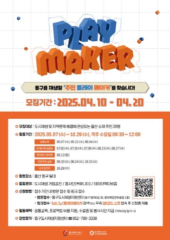 [무한뉴스=최진수 기자] 울산 동구 도시재생지원센터는 지역 주민의 도시재생 역량 강화를 위해 ‘도시재생 플레이메이커(리더) 양성 과정’ 참여자를 모집한다. 이번 양성 과정은 주민 주도의 도시재생 실현과 공동체 활성화 및 주민 참여 확대에 목적이 있다.