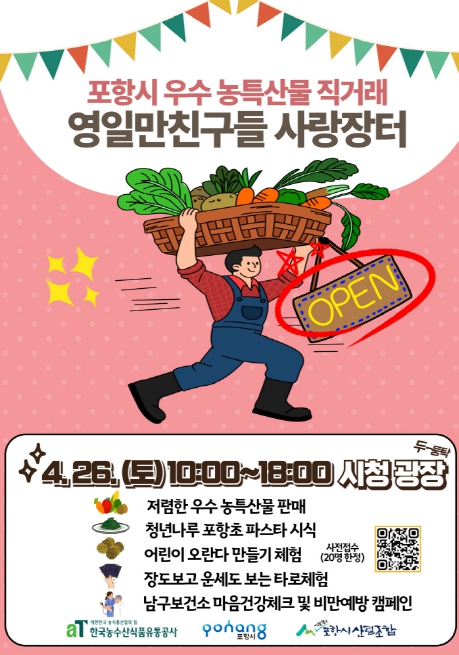 [무한뉴스=최진수 기자] 포항시는 오는 26일 시청광장에서 포항시 우수 농특산물 정례 직거래장터인 ‘영일만친구들 사랑장터’를 개장한다.
