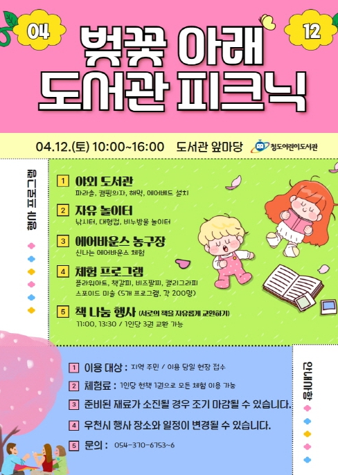 [무한뉴스=최진수 기자] 청도군(군수 김하수)은 오는 4월 12일 토요일 오전 10시부터 오후 4시까지 청도어린이도서관 앞마당에서 야외 도서관 체험 행사인'벚꽃 아래 도서관 피크닉'을 개최한다.