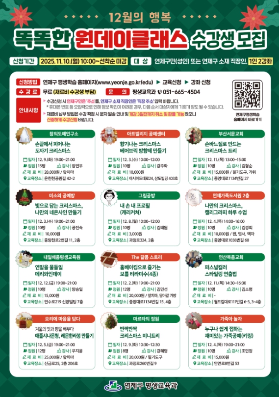 [무한뉴스=최진수 기자] 연제구는 11월 10일부터 ‘2025년 제2차 똑똑한 원데이 클래스’ 프로그램 수강생을 선착순 모집한다.