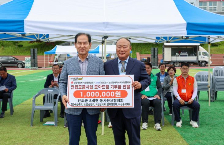 [무한뉴스=정민정 기자] 진도군을 대표하는 봉사단체인 군내면 심죽회, 고군면 송림회, 의신면 신의회, 임회면 선진회, 지산면 동백회가 관내 위기가구 발굴과 지원을 위한 연합모금 사업 ‘모아드림’에 기부금 100만 원을 기탁 했다.