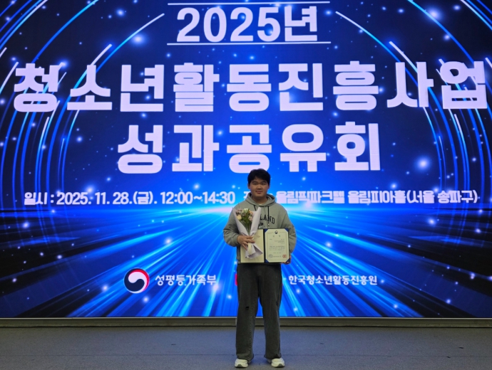 [무한뉴스=정민정 기자] 순천시는 지난 28일 서울특별시 올림픽파크텔에서 열린 2025년 청소년활동진흥사업 통합 성과공유회에서 순천시청소년문화의집 방과후아카데미를 수료한 왕윤성 학생이 『2025년 청소년방과후아카데미 활동수기 공모전』 일반부문에서 성평등가족부 장관상(대상)을 수상하는 쾌거를 이뤘다고 밝혔다.
