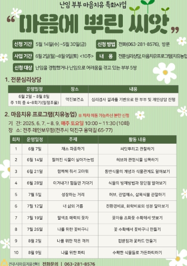 [무한뉴스=정민정 기자] 전주시 마음치유센터는 난임 부부를 위한 특별 치유 프로그램 ‘마음에 뿌린 씨앗’을 오는 6월부터 8월까지 10주간 운영한다.