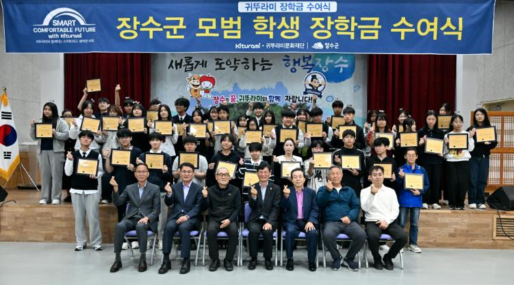 이번 행사는 귀뚜라미그룹과 장수군이 함께 지역의 우수한 학생들을 격려하고 미래 인재로 성장할 수 있도록 지원하기 위해 마련된 자리로, 관내 중·고등학생 50명에게 총 5천만 원의 장학금과 장학증서가 전달됐다.