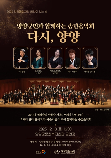 [무한뉴스=정민정 기자] (재)양양문화재단은 오는 12월 13일 오후 4시, 양양군문화복지회관 공연장에서 정민 상임지휘자가 이끄는 강릉시립교향악단과 소프라노 이승은, 메조소프라노 이단비, 테너 이형석, 바리톤 안대현이 함께하는 '2025 양양군민과 함께하는 송년음악회 – 다시, 양양'을 개최한다.