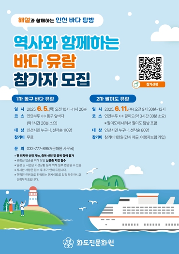 [무한뉴스=정승훈 기자] 인천 동구 화도진문화원은 인천시민을 대상으로 연안부두를 출발해 동구 앞바다와 팔미도를 둘러보는 해양 유람 프로그램을 6월 운영한다고 밝혔다.