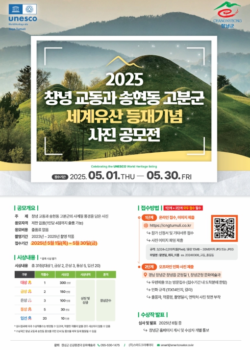 대상 수상자에게는 300만 원, 금상 수상자에게는 각 150만 원의 상금이 주어지며, 선정된 작품은 향후 창녕 교동과 송현동 고분군 사진 전시 및 홍보 활동에 활용될 예정이다.