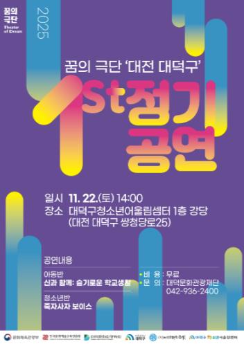 [무한뉴스=정민정 기자] 대덕문화관광재단은 오는 22일 대덕구청소년어울림센터에서 ‘2025 꿈의 극단 대덕구 정기공연’을 개최한다고 밝혔다.
