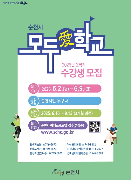 [무한뉴스=정민정 기자] 순천시는 2025년 2학기 모두愛학교 교육에 참여할 수강생을 오는 6월 2일부터 6월 9일까지 8일간 모집한다고 밝혔다.