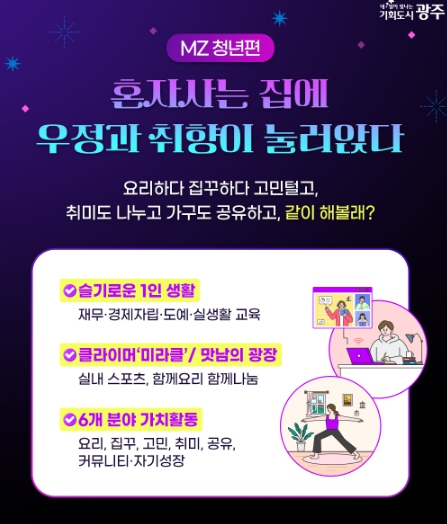 [무한뉴스=정민정 기자] 광주시가 1인가구의 생애주기별 특성을 반영한 ‘솔로 투게더(Solo Together) 정책’을 선보인다. 1인 가구의 삶에 실질적으로 도움을 주고, 일상에서 체감하는 즐거움을 더할 생활밀착형 사업들이다.
