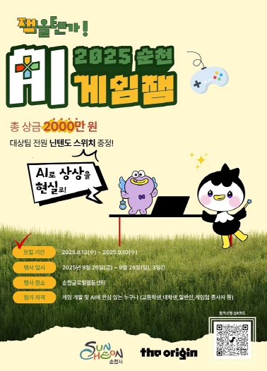 [무한뉴스=정민정 기자] 순천시가 AI 기술을 결합한 전국 규모의 게임잼 행사를 개최한다. 이번 행사는 원도심 클러스터에 입주 예정인 게임 특화 종합 콘텐츠기업인 ㈜디오리진과 협업 추진해 게임산업에 대한 이해를 높이고 인재 발굴 등 콘텐츠산업의 성장 발판을 다지기 위해 준비됐다.