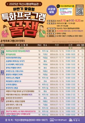 [무한뉴스=정민정 기자] 익산시는 평생학습관에서 시민들의 자기계발과 삶의 질 향상을 위한 2025년 하반기 맞춤형 특화 프로그램 '꿀잼 강좌' 수강생을 모집한다고 14일 밝혔다.
