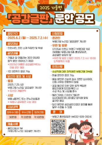 [무한뉴스=정승훈 기자] 부평구가 오는 2일부터 다음달 2일까지 한 달간 ‘2025년 가을편 공감글판’ 문안을 공모한다.