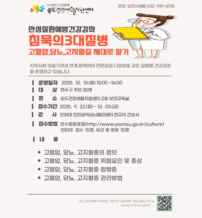 [무한뉴스=정승훈 기자] 연수구 송도건강생활지원센터는 오는 10월 13일 지역 주민을 대상으로 무료 건강 강좌 ‘침묵의 3대 질병: 고혈압, 당뇨, 고지혈증 제대로 알기’를 진행한다.