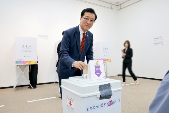 [무한뉴스=정민정 기자] 대전시의회 조원휘 의장은 제21대 대통령선거 사전투표 첫날인 29일 대전시청 1층 전시실에 마련된 둔산1동 사전투표소를 방문해 투표에 참여했다.