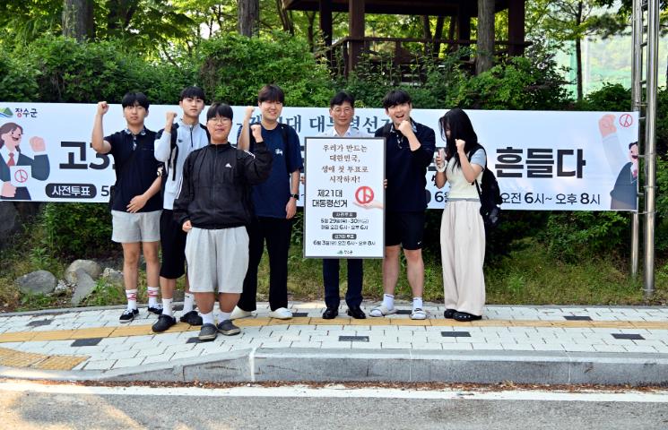 [무한뉴스=정민정 기자] 장수군은 29일 제21대 대통령선거 사전투표일을 맞아 장수고등학교 정문 앞에서 생애 첫 투표에 나서는 고3 학생들을 대상으로 투표 독려 캠페인을 전개했다.