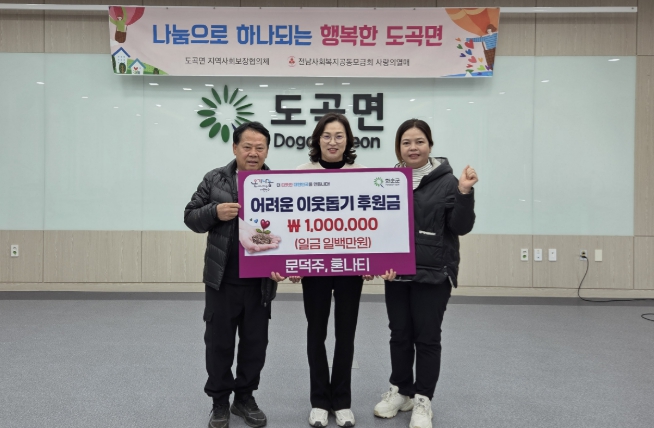 [무한뉴스=정민정 기자] 도곡면은 지난 14일 관내에 거주하는 문덕주·혼나티 부부가 지역 내 어려운 이웃을 위해 100만 원을 도곡면 지역사회보장협의체에 기부했다고 밝혔다.