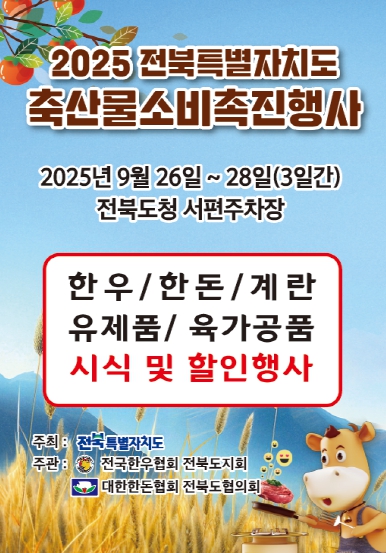 [무한뉴스=정민정 기자] 전북특별자치도가 추석 명절을 맞아 도민들에게 안전하고 품질 좋은 축산물을 저렴하게 제공하기 위해 ‘2025년 축산물 소비촉진행사’를 연다. 도는 이번 행사를 9월 26일부터 28일까지 사흘간 도청 서편광장에서 개최한다고 23일 밝혔다.