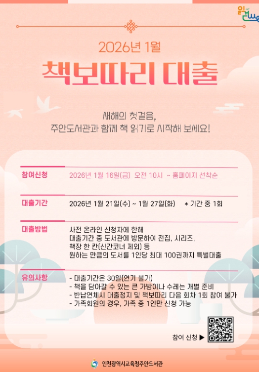 [무한뉴스=정승훈 기자] 인천광역시교육청주안도서관은 지역주민의 독서문화 정착과 대출 활성화를 위하여 2025년에 이어 올해도 '책 보따리 대출'을 실시한다고 14일 밝혔다.