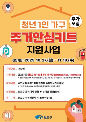 [무한뉴스=최진수 기자] 부산 영도구는 지역 내 청년 1인 가구의 주거 안심도를 높이고 사회적 고립감을 해소하는 등 안전한 주거환경을 조성하고자 ‘청년 1인 가구 주거안심키트 지원사업’을 1차에 이어 2차로 추가 모집에 나선다.