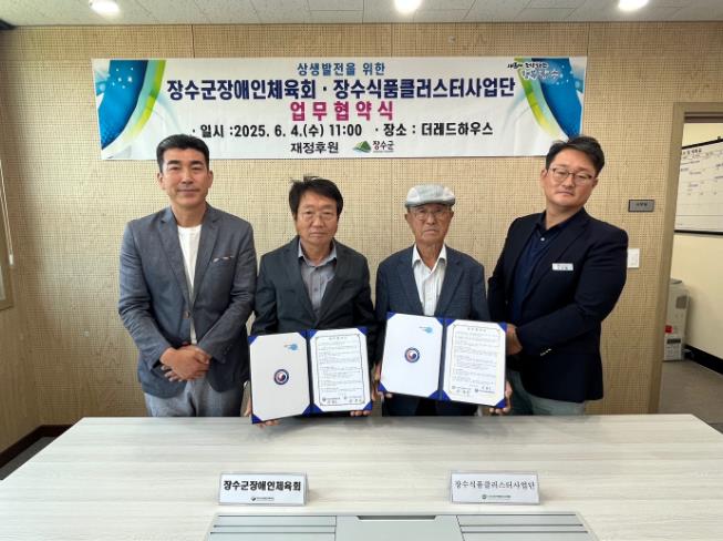 이날 협약식에는 유봉수 장수군장애인체육회 상임부회장, 송남수 (사)장수식품클러스터사업단 단장을 비롯한 관계자들이 참석해 상호 협력 의지를 다졌다.