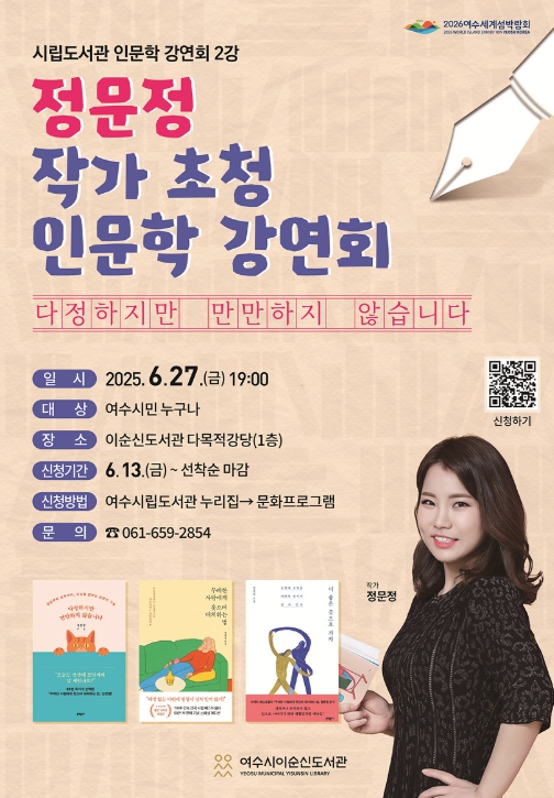 [무한뉴스=정민정 기자] 여수시가 오는 27일 오후 7시 이순신도서관 다목적강당에서 정문정 작가 초청 ‘인문학 강연회’를 개최한다.