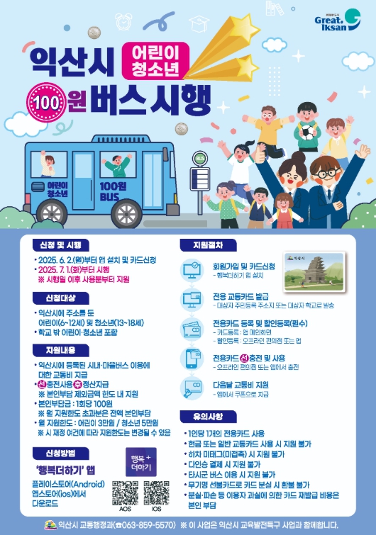 [무한뉴스=정민정 기자] 익산시 '어린이·청소년 100원 버스'가 신청자 1만 명을 돌파하며 순조롭게 정착하고 있다.
