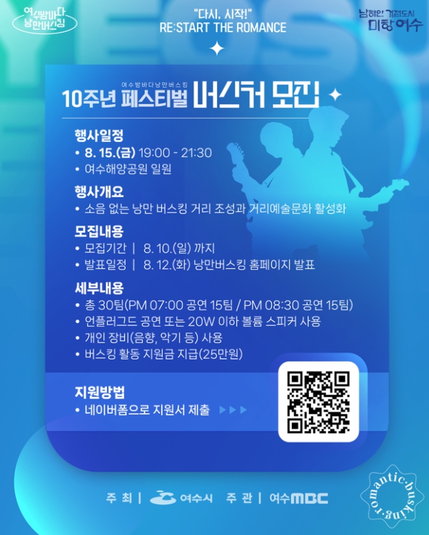 [무한뉴스=정민정 기자] 여수시는 오는 8월 15일 오후 7시부터 9시 30분까지 해양공원 일원에서 ‘2025 여수밤바다 낭만버스킹 페스티벌’을 개최한다.