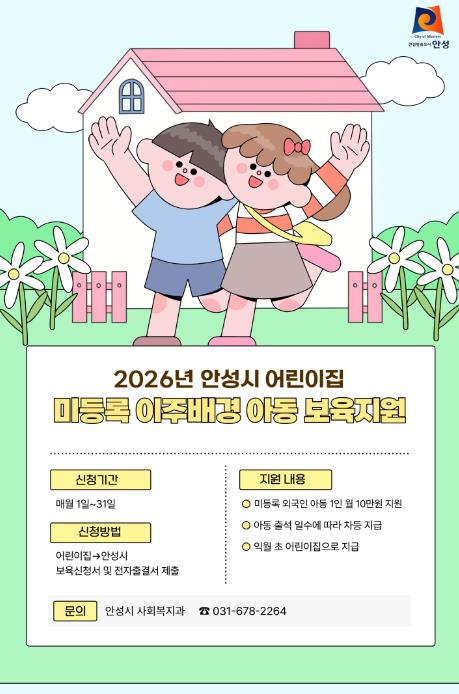 [무한뉴스=정충근 기자] 안성시는 2026년부터 어린이집에 다니는 미등록 외국인(이주배경) 영유아에게 월 10만원의 보육지원금을 지원한다고 밝혔다.