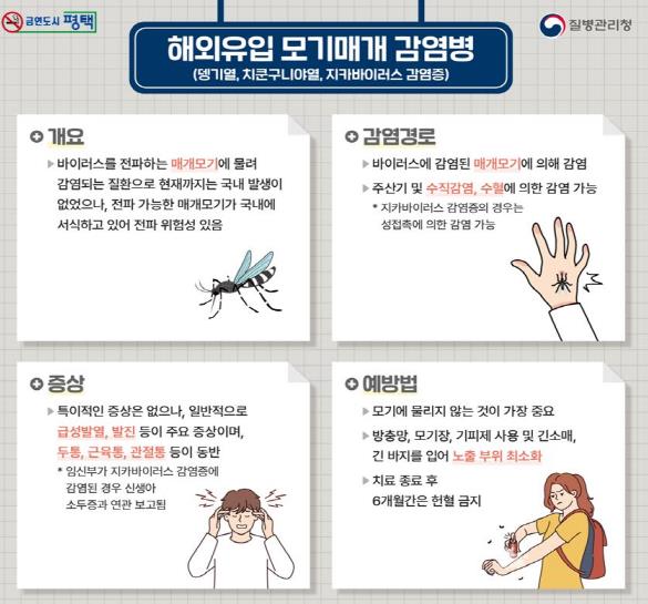 지카바이러스 감염증은 지카바이러스에 감염된 숲모기에 물려 전파되며, 3~14일의 잠복기를 거쳐 반점 구진성 발진과 발열, 결막충혈, 관절통, 근육통 등의 증상이 나타난다. 모기물림 외에 성 접촉이나 바이러스에 감염된 혈액제제의 수혈, 모자간 수직감염, 실험실 노출 등을 통해서도 전파될 수 있다. 특히 임신 중 감염 시 조산, 태아 사망 및 사산, 소두증, 선천성 기형 등 심각한 결과를 초래할 수 있다. 지카 바이러스 외에도 해외 유입 모기 매개 감염병인 뎅기열, 치쿤구니야열은 동남아시아 지역을 중심으로 지속 발생하고 있어 주의해야 한다.