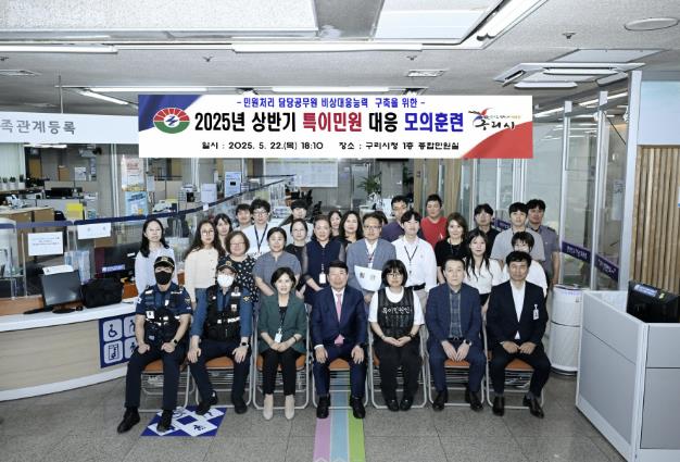 [무한뉴스=정승훈 기자] 구리시는 폭언·폭행 등 악성민원으로부터 담당 공무원을 보호하고 안전한 민원 환경을 조성하기 위해 지난 22일 구리시청 1층 종합민원실에서 구리경찰서와 합동으로‘2025년 상반기 특이민원 발생 대비 모의훈련’을 실시했다.