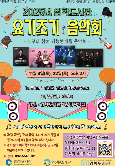 [무한뉴스=정승훈 기자] 인천 계양구 임학도서관(관장 권경회)에서 지역 주민을 대상으로 ‘요기조기 음악회’를 개최한다.