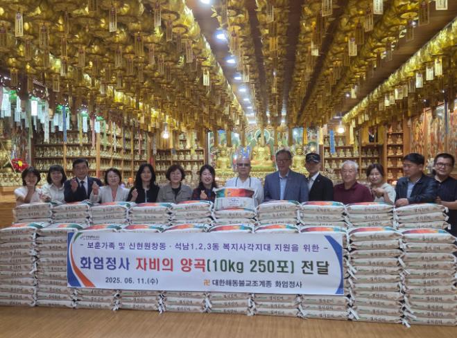 [무한뉴스=정승훈 기자] 사단법인 대한해동불교조계종 화엄정사는 지난 11일 관내 소외계층을 위한 자비의 양곡 250포(2,500kg)를 신현원창동·석남1·2·3동 행정복지센터와 보훈단체에 각 50포씩 전달했다.