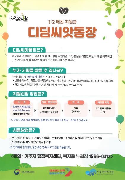 디딤씨앗통장은 아동이 매월 일정 금액을 저축하면 정부와 지자체가 매칭 비율 1:2로 월 최대 10만 원까지 추가 적립해 주는 사업이다. 예를 들어 본인이나 보호자, 후원자가 매달 5만 원을 저축하면, 지자체와 정부가 10만 원을 더해 총 15만 원이 적립된다. 이를 15년간 유지할 경우, 총 3천만 원 규모의 자산을 마련할 수 있다.