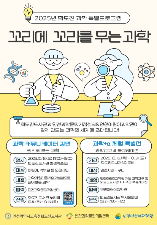 [무한뉴스=정승훈 기자] 인천광역시교육청화도진도서관은 지역사회의 과학문화 확산을 도모하기 위하여 오는 10월 16일부터 31일까지 인천시민 대상‘꼬리에 꼬리를 무는 과학’을 운영한다.