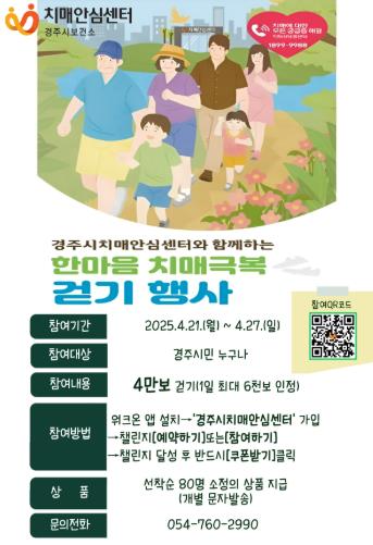 [무한뉴스=최진수 기자] 경주시 치매안심센터는 치매에 대한 사회적 공감대 형성과 극복 의지 확산을 위해 오는 21일부터 27일까지 모바일 앱 ‘워크온(Walk-On)’을 활용한 ‘2025년 한마음 치매극복 걷기행사’를 개최한다고 밝혔다.