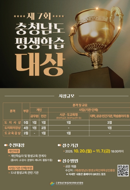 [무한뉴스=정민정 기자] 충남평생교육인재육성진흥원은‘2025년 제7회 충남 평생학습대상’표창 공모를 실시한다고 23일 밝혔다.