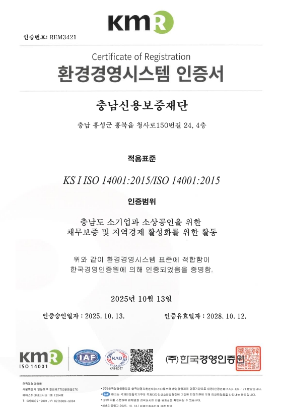 [무한뉴스=정민정 기자] 충남신용보증재단은 한국경영인증원(KMR)으로부터 ISO 14001:2015(환경경영시스템) 인증을 취득했다고 17일 밝혔다.