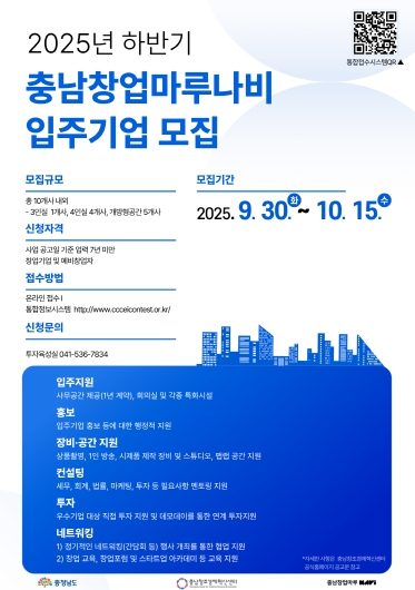 [무한뉴스=정민정 기자] (재)충남창조경제혁신센터는 오는 10월 15일까지 2025년 하반기 충남창업마루나비 입주기업을 모집한다고 밝혔다. 이번 모집은 혁신적인 아이디어와 성장 잠재력을 지닌 스타트업을 발굴해 안정적인 보육 환경을 제공하고, 기업의 지속적인 성장을 지원하기 위해 추진된다.