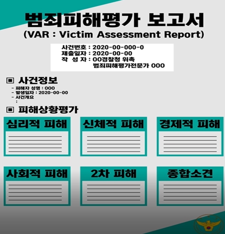 범죄피해평가 절차는, ①피해자 전담경찰관이 사건발생 초기에 피해자의 동의를 얻은 후 전문가에게 연계하면 ②전문가는 피해자와 1, 2차에 걸친 심리검사와 면담을 통해 심리적‧신체적‧경제적‧사회적‧2차 피해 내용을 종합적으로 평가한'범죄피해평가보고서'를 작성한 다음 담당 수사관에게 보고서를 전달하고, ③담당 수사관은 보고서를 사건기록에 편철하여 검찰에 송치하면, ④검찰‧법원에서는 보고서를 가해자에 대한 구속‧양형의 판단기준으로 활용한다.