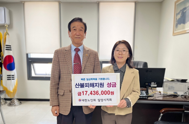 [무한뉴스=최진수 기자] (사)대한노인회 밀양시지회는 전국에서 발생한 대형산불로 큰 피해를 입은 지역의 복구와 이재민 지원을 위해 지난 1일부터 9일까지 성금 1,743만 6천원을 모금했다고 11일 밝혔다.