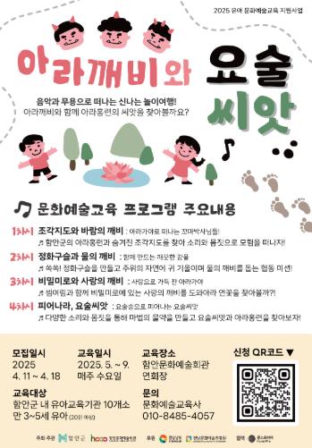 [무한뉴스=최진수 기자] 함안문화예술회관은 (재)경남문화예술진흥원 주관 ‘2025 유아문화예술교육지원사업’의 일환으로 운영하는 유아문화예술교육 프로그램 ‘아라깨비와 요술씨앗’의 참여 기관을 모집한다고 밝혔다.