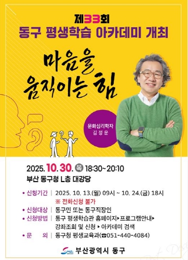 [무한뉴스=최진수 기자] 부산 동구는 오는 10월 30일, 동구청 층 대강당에서 문화심리학자 김정운 소장