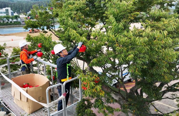 군수는 17일 축제장 중앙의 느티나무 앞에서 리프트기에 올라 사과 조형물을 직접 설치하며 축제 준비를 진두지휘했다.