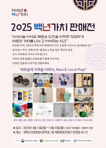 [무한뉴스=최진수 기자] 안동시와 위덕대학교 산학협력단(단장 박진기)은 4월 14일을 시작으로, 12월 말까지 경북신사업창업사관학교(안동시 번영길 42-2) 1층에서 ‘2025년 백년가치 판매전’을 개최한다.