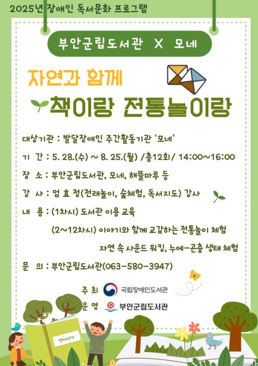 [무한뉴스=정민정 기자] 부안군립도서관은 오는 28일부터 8월 25일까지 발달장애인을 위한 독서문화 프로그램 ‘자연과 함께 책이랑 전통놀이랑’을 총 12회에 걸쳐 운영한다고 밝혔다.