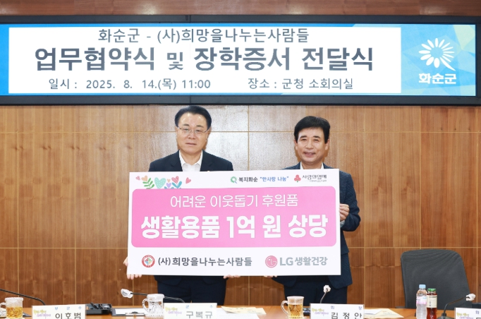 [무한뉴스=정민정 기자] 화순군은 지난 14일 (사)희망을나누는사람들(회장 김정안)과'희망나눔운동'업무협약을 체결하고 장학 증서 전달식을 가졌다고 밝혔다.