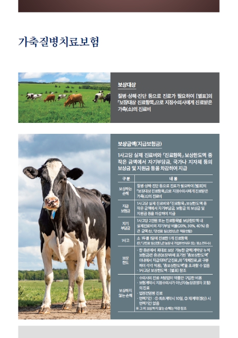 가축질병치료보험 지원 사업은 가축질병으로 인한 축산농가 경제적 손실 예방과 농가 생산성 제고를 위해 가축질병치료보험(보험사 NH농협손해보험)에 가입한 농가의 보험료를 최대 80%를 지원해 주는 제도이다.